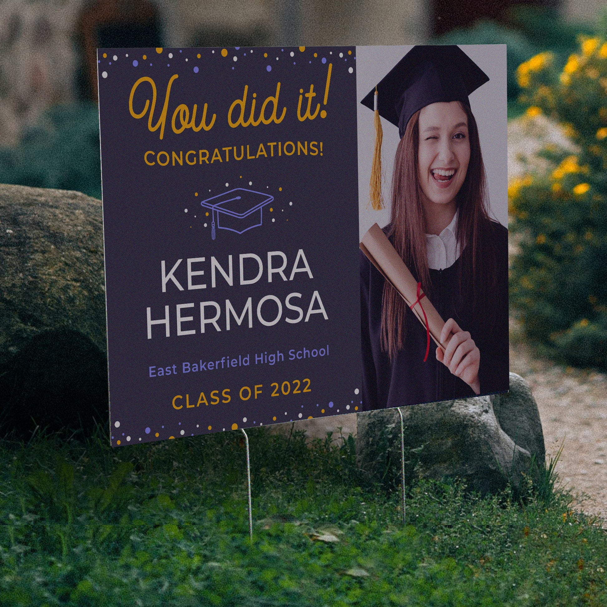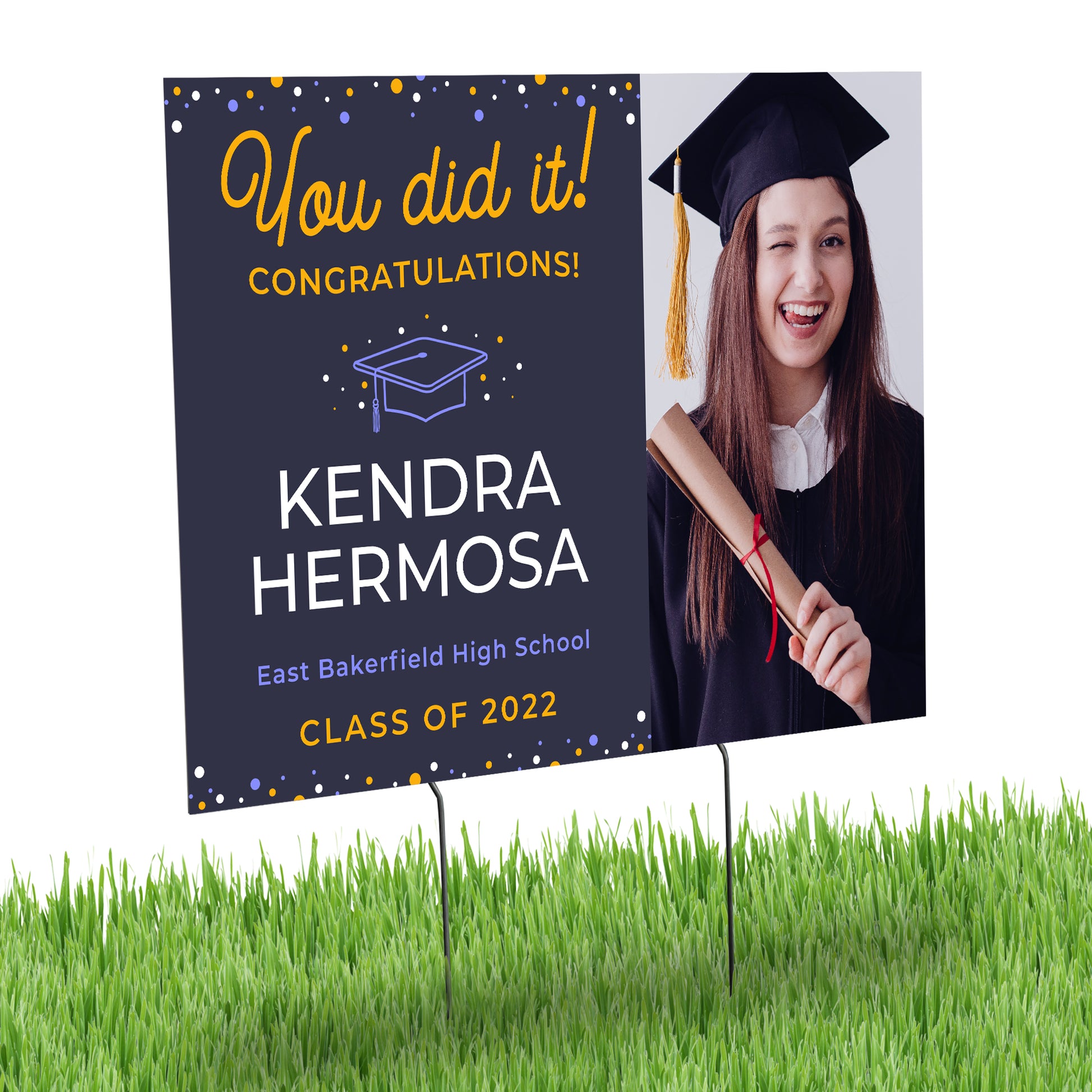 - CUSTOM YARD SIGN - Congratulate the new graduates with our unique graduation sign that includes a custom photo, message, and two aluminum yard stakes. This is perfect for preschool and high school moving up ceremonies, and college graduation parties.
