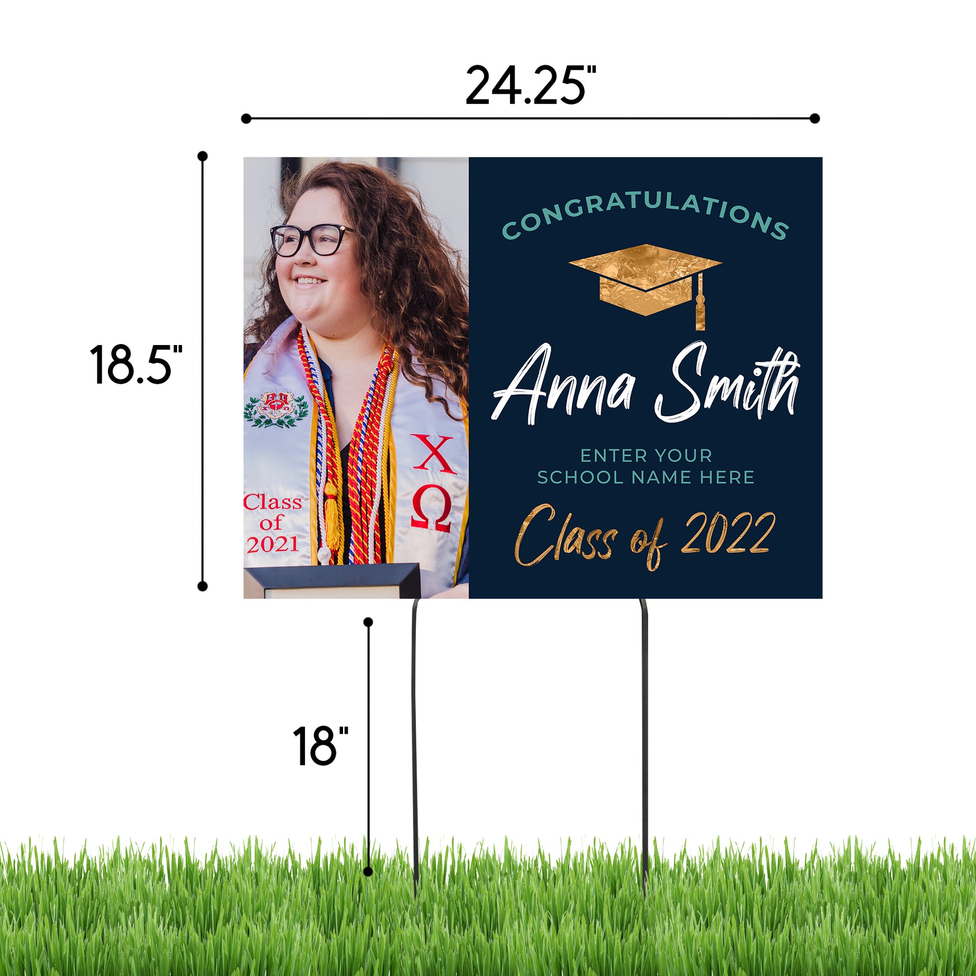 - CUSTOM YARD SIGN - Congratulate the new graduates with our unique graduation sign that includes a custom photo, message, and two aluminum yard stakes. This is perfect for preschool and high school moving up ceremonies, and college graduation parties.