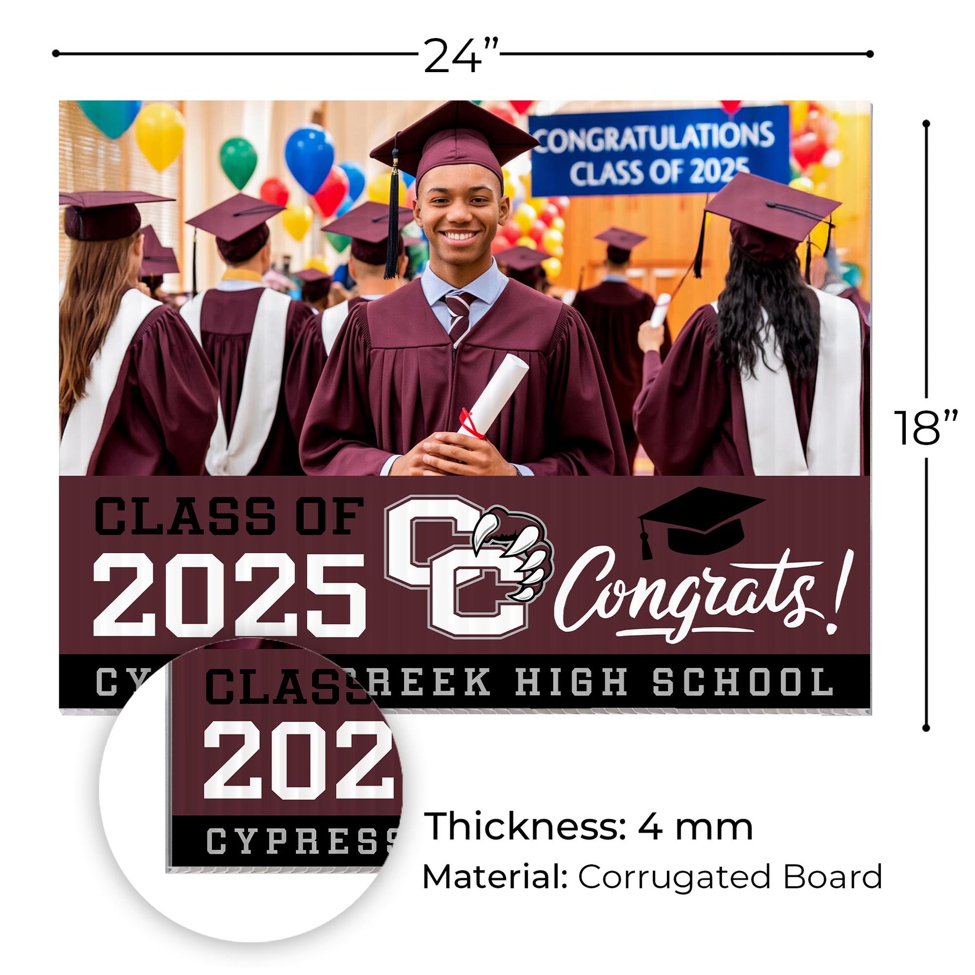 Customizable Design – Celebrate the achievements of Cypress Creek High School graduates with personalized yard signs. Add the graduate's name, graduation year, and a congratulatory message to create a unique, custom tribute, making it easy for friends, family, and the community to recognize and honor their accomplishment.
