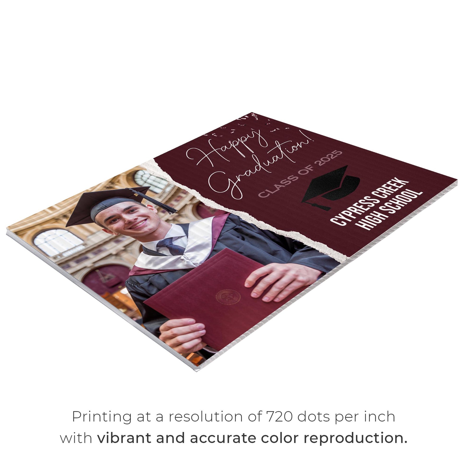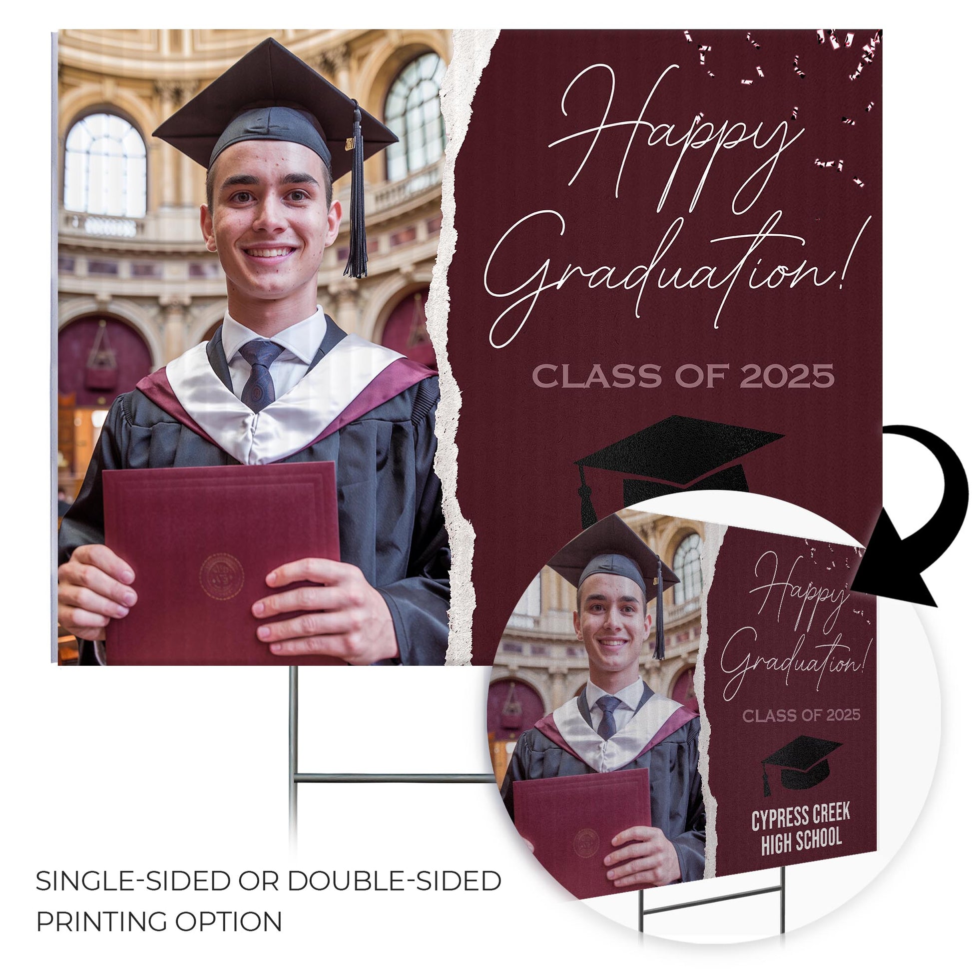 Vibrant Full-Color Printing – Make a statement with bold, full-color graphics printed on both sides of the sign. The eye-catching congratulatory message, along with the graduate's details, ensures visibility from every angle, helping to celebrate this special milestone in style.