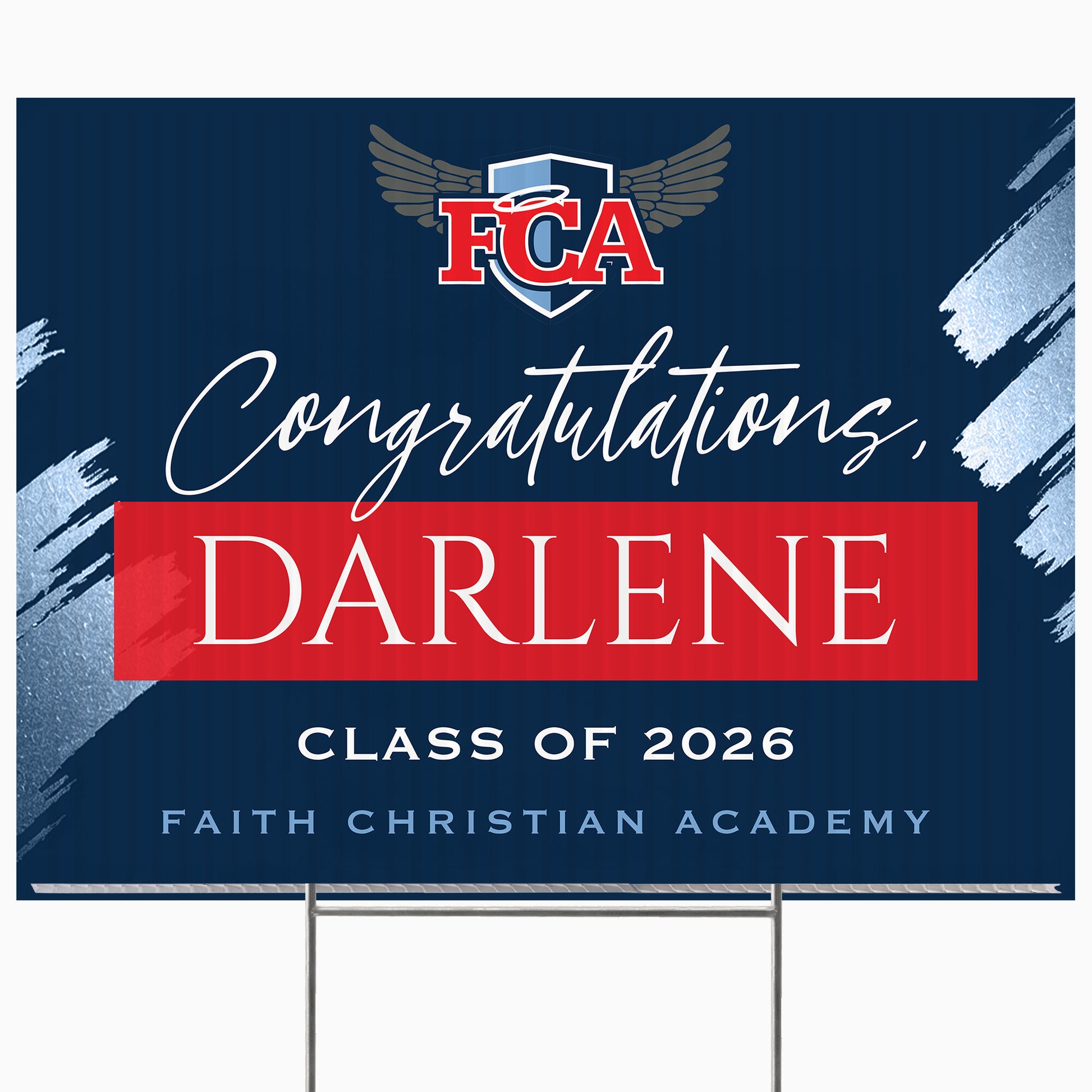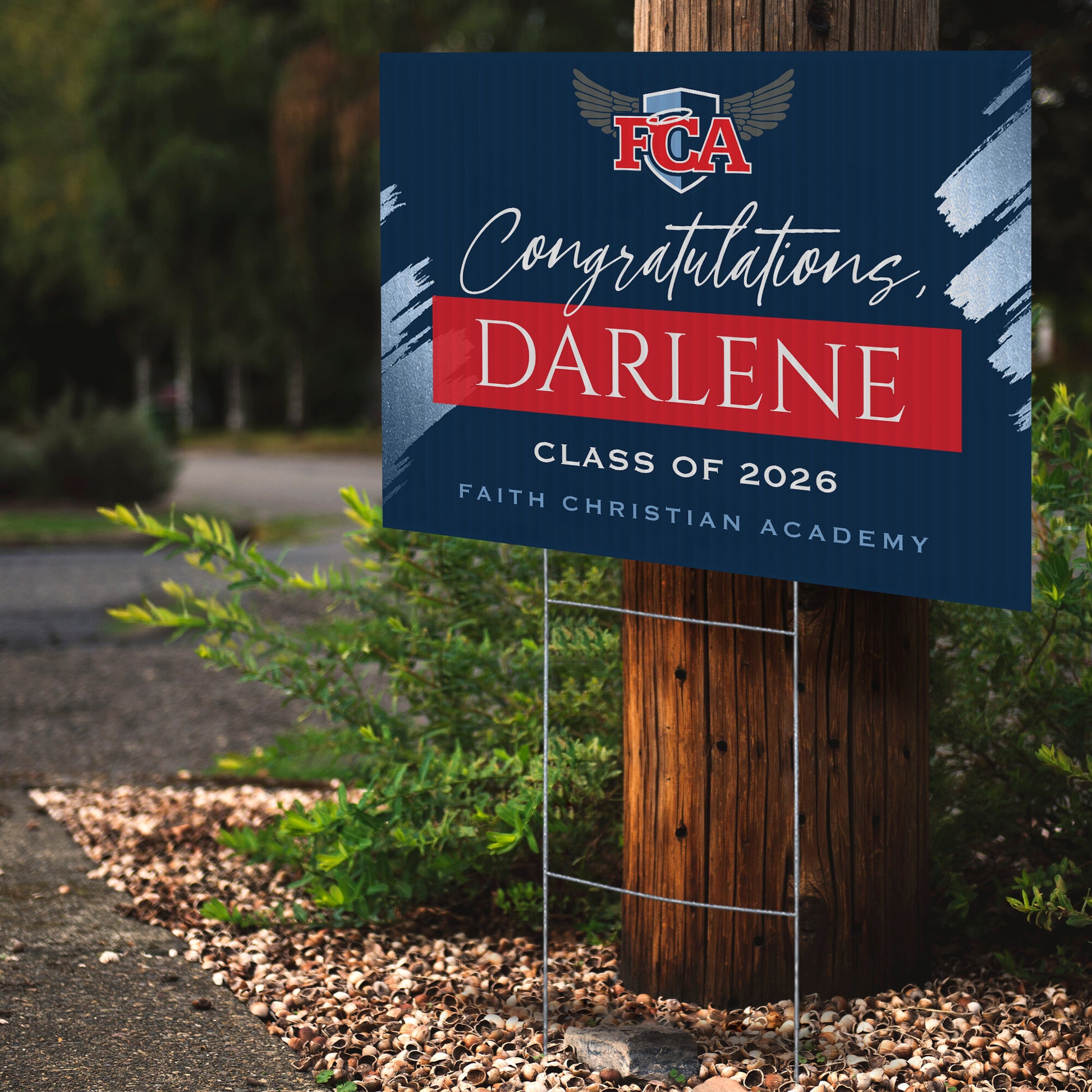 Customizable Design - Celebrate the achievements of Faith Christian Academy graduates with personalized yard signs. Add the graduate's name, graduation year, and a congratulatory message to create a unique, custom tribute, making it easy for friends, family, and the community to recognize and honor their accomplishment.
