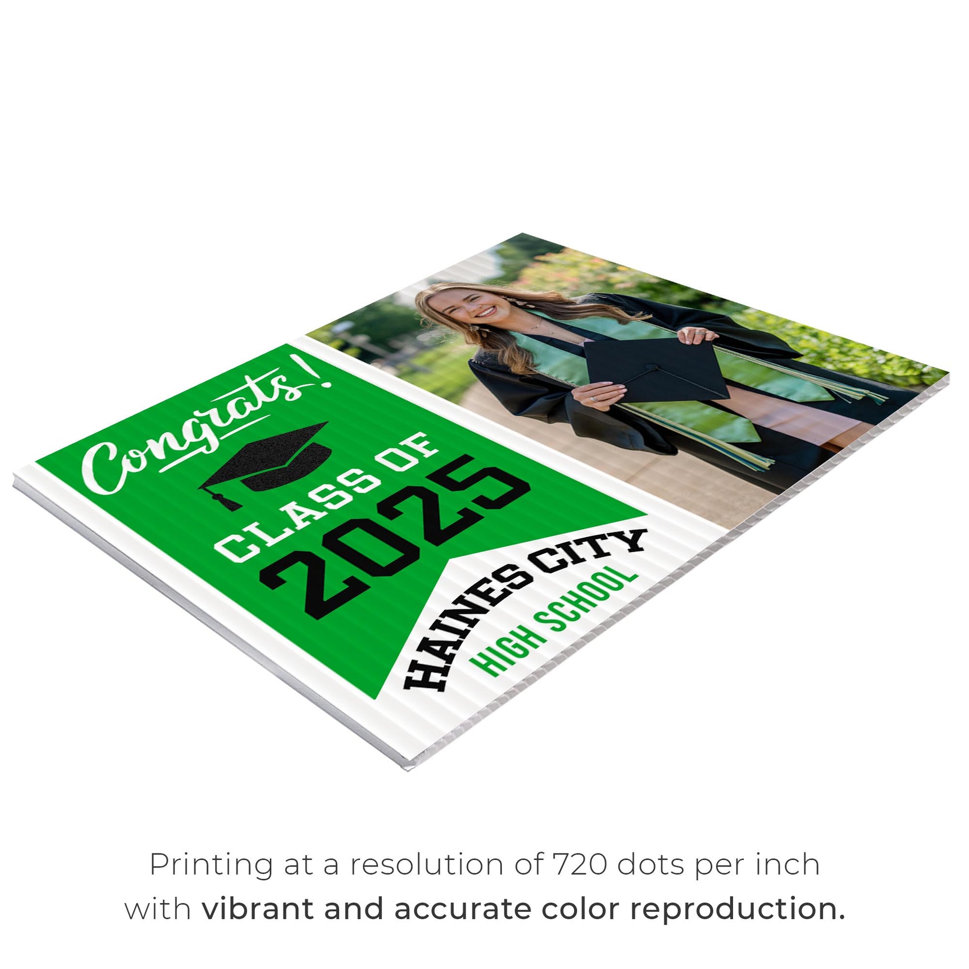 Vibrant Full-Color Printing – Make a statement with bold, full-color graphics printed on both sides of the sign. The eye-catching congratulatory message, along with the graduate's details, ensures visibility from every angle, helping to celebrate this special milestone in style.