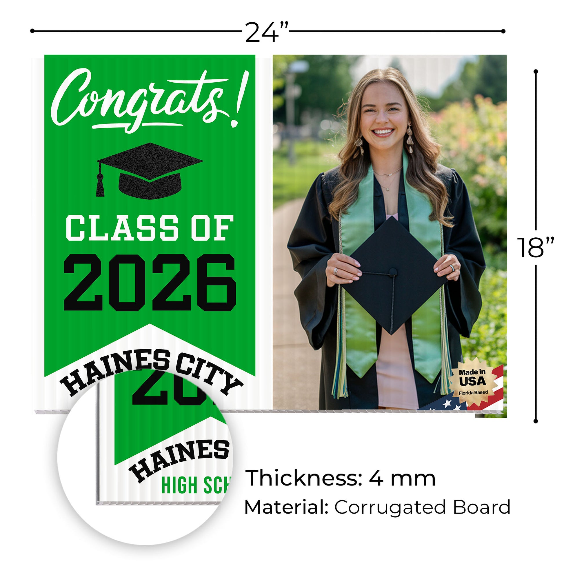 Weatherproof & Durable – Crafted from high-quality corrugated plastic, our yard signs are built to endure all weather conditions. Whether rain, sun, or wind, these signs retain their vibrant colors, offering a reliable and lasting way to showcase pride in Haines City Senior High School graduates.