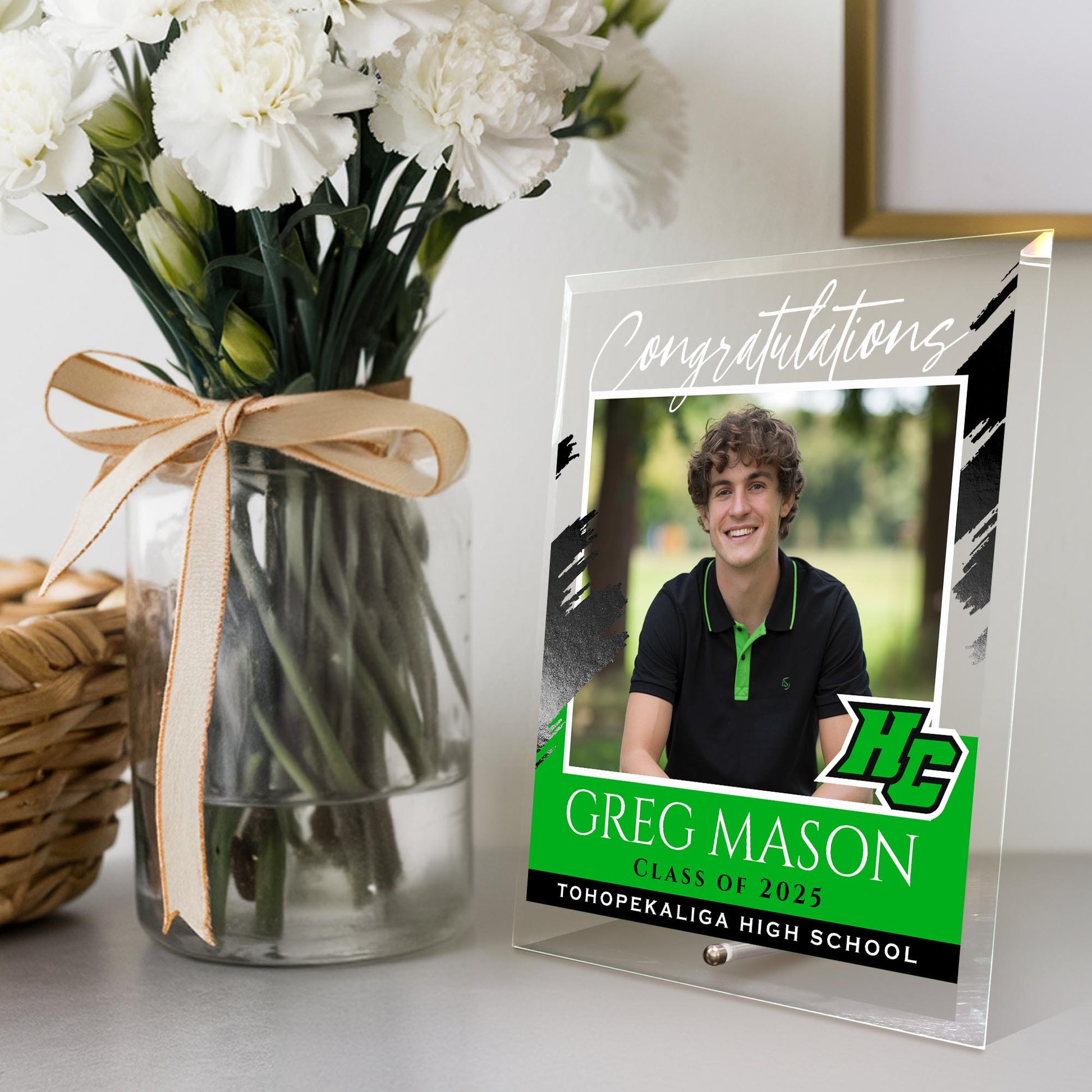Vibrant Full-Color Printing – Make a statement with bold, full-color graphics expertly printed onto the glass surface. The eye-catching congratulatory message, along with the graduate's details, ensures it stands out and commemorates their achievement in style.