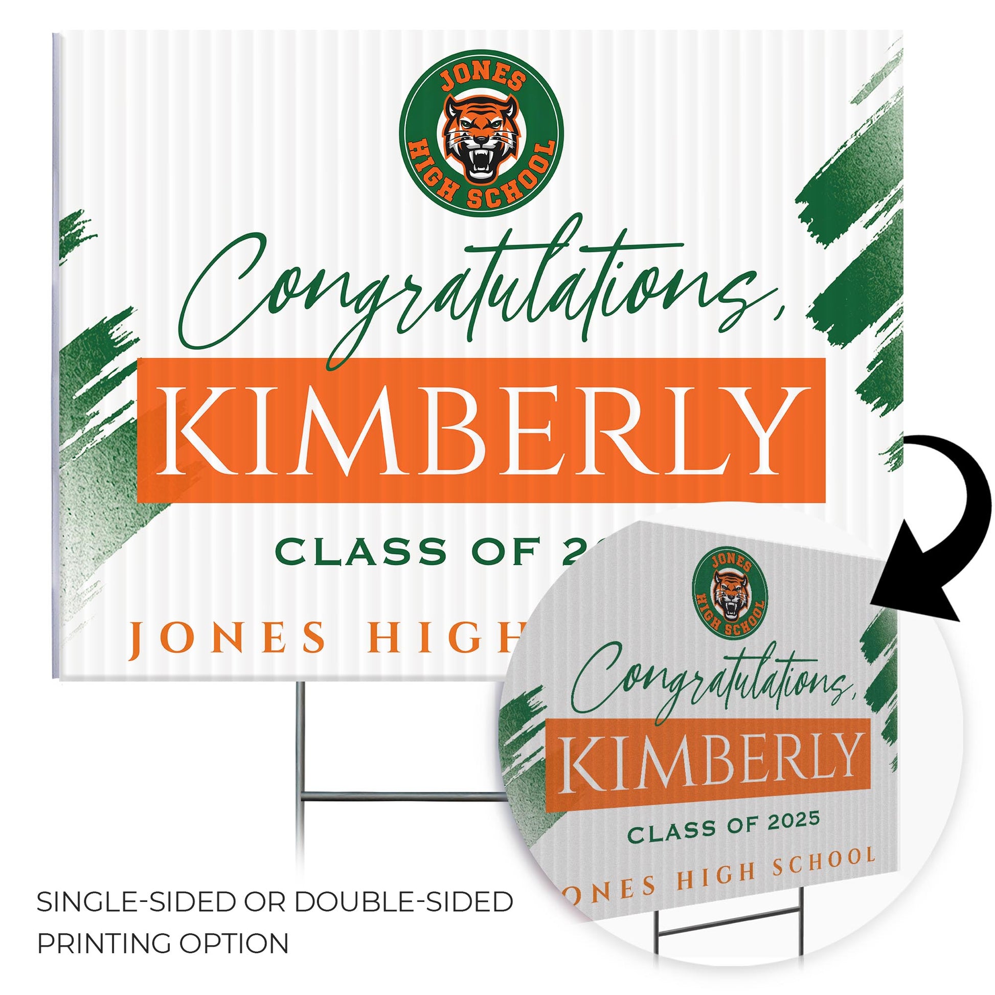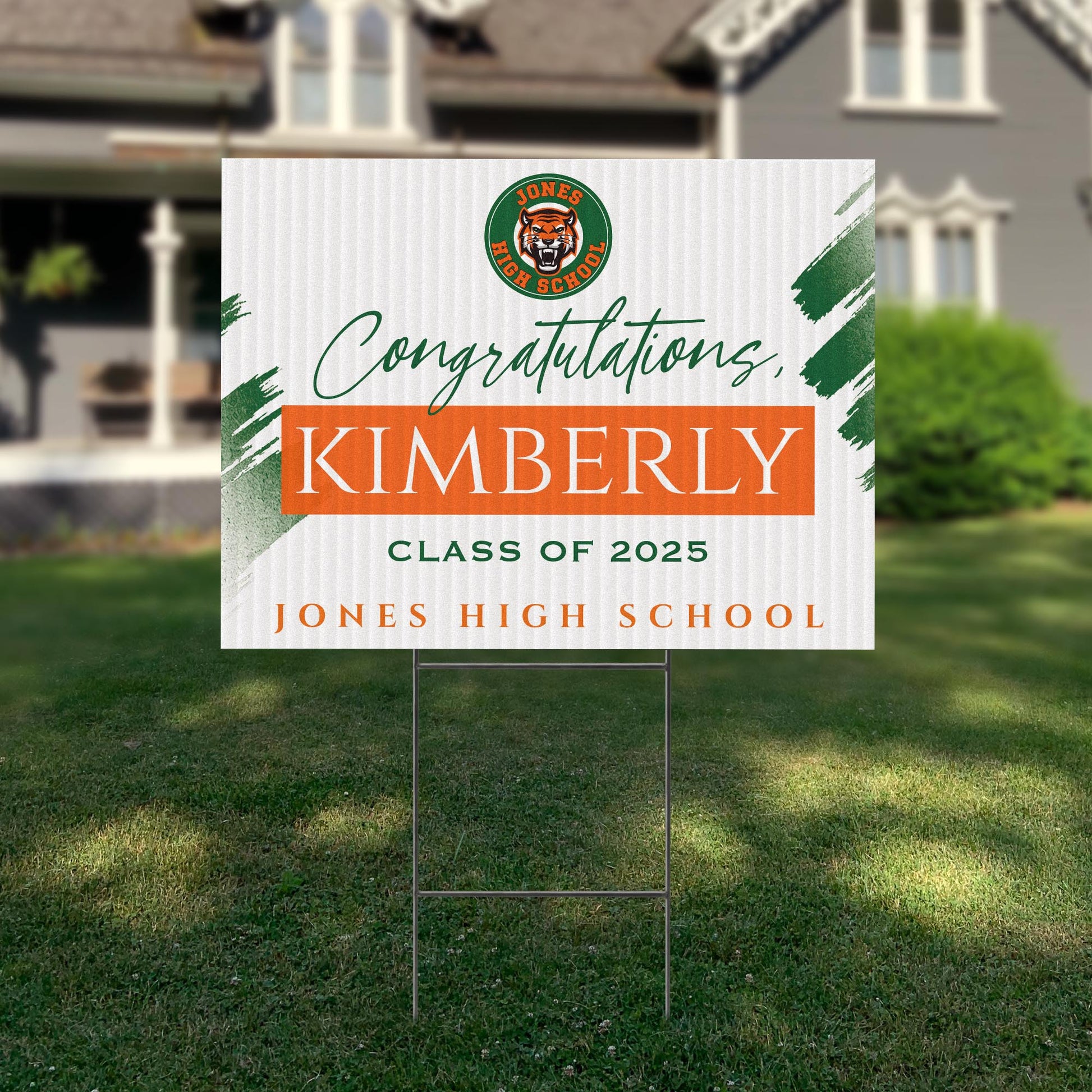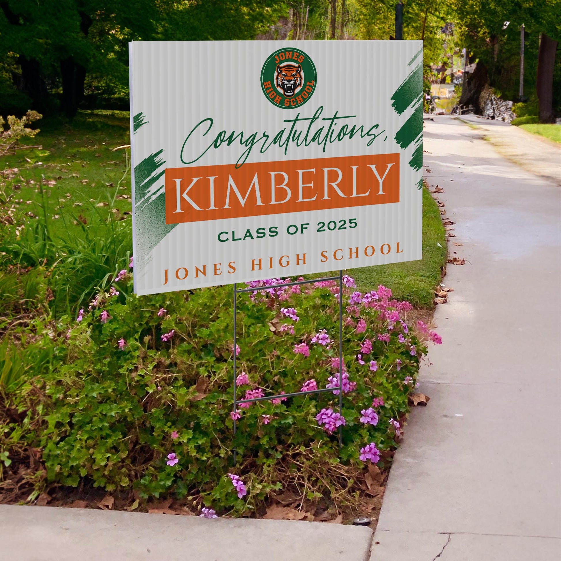 Customizable Design – Celebrate the achievements of Jones High School graduates with personalized yard signs. Add the graduate's name, graduation year, and a congratulatory message to create a unique, custom tribute. It’s a simple (and super cool) way for friends, family, and the whole community to recognize and honor their big moment.