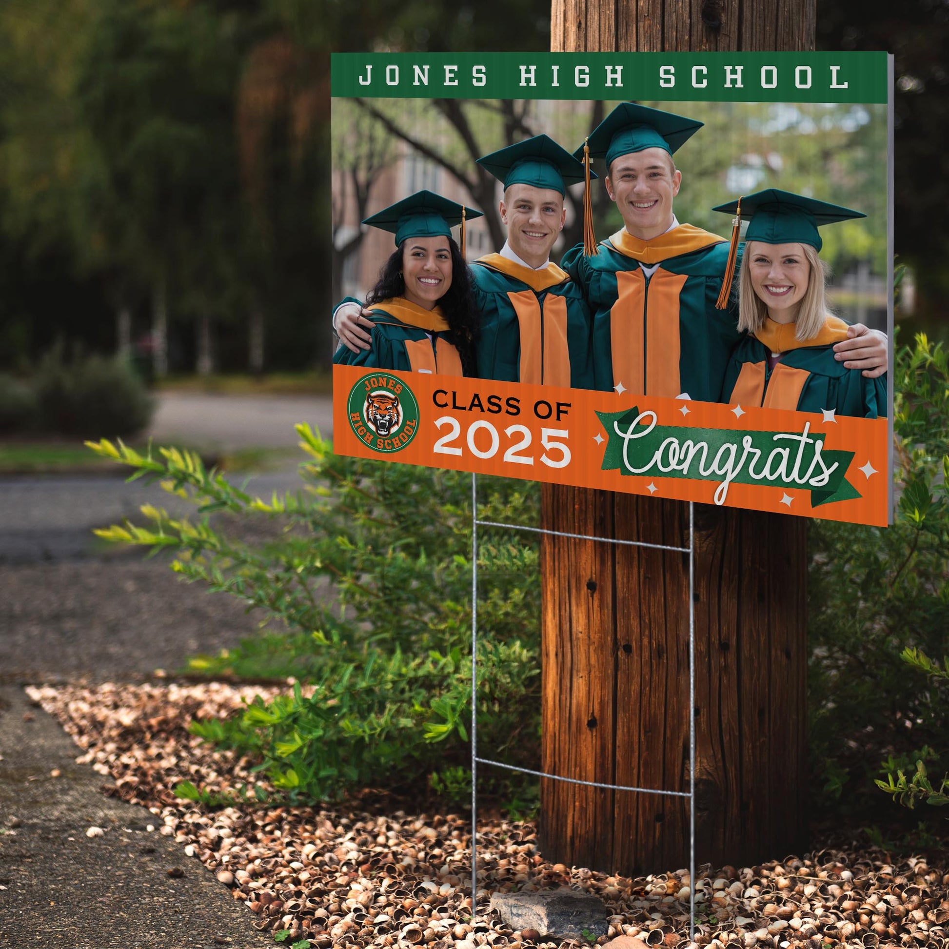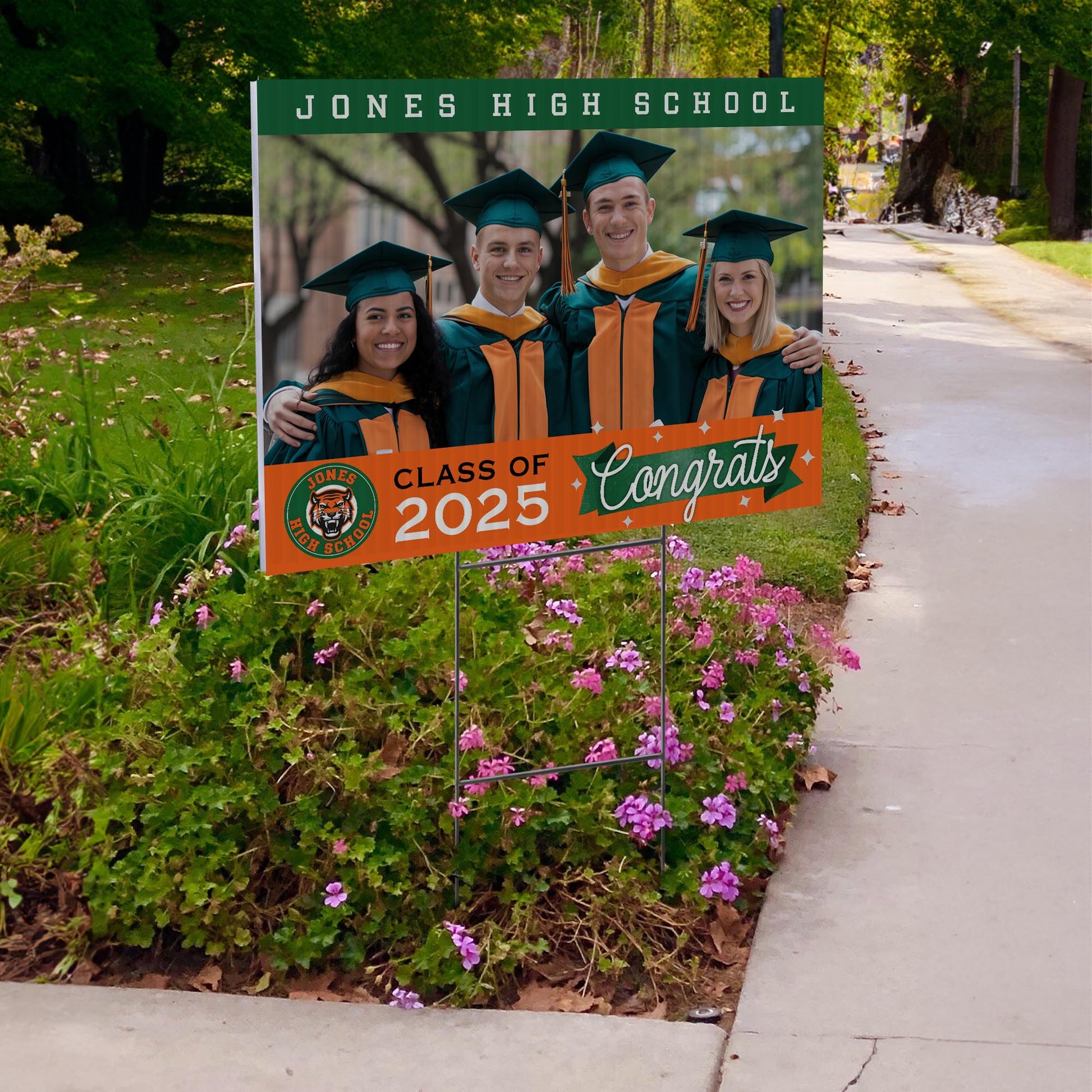 Customizable Design – Celebrate the achievements of Jones High School graduates with personalized yard signs. Add the graduate's name, graduation year, and a congratulatory message to create a unique, custom tribute. It’s a simple (and super cool) way for friends, family, and the whole community to recognize and honor their big moment.