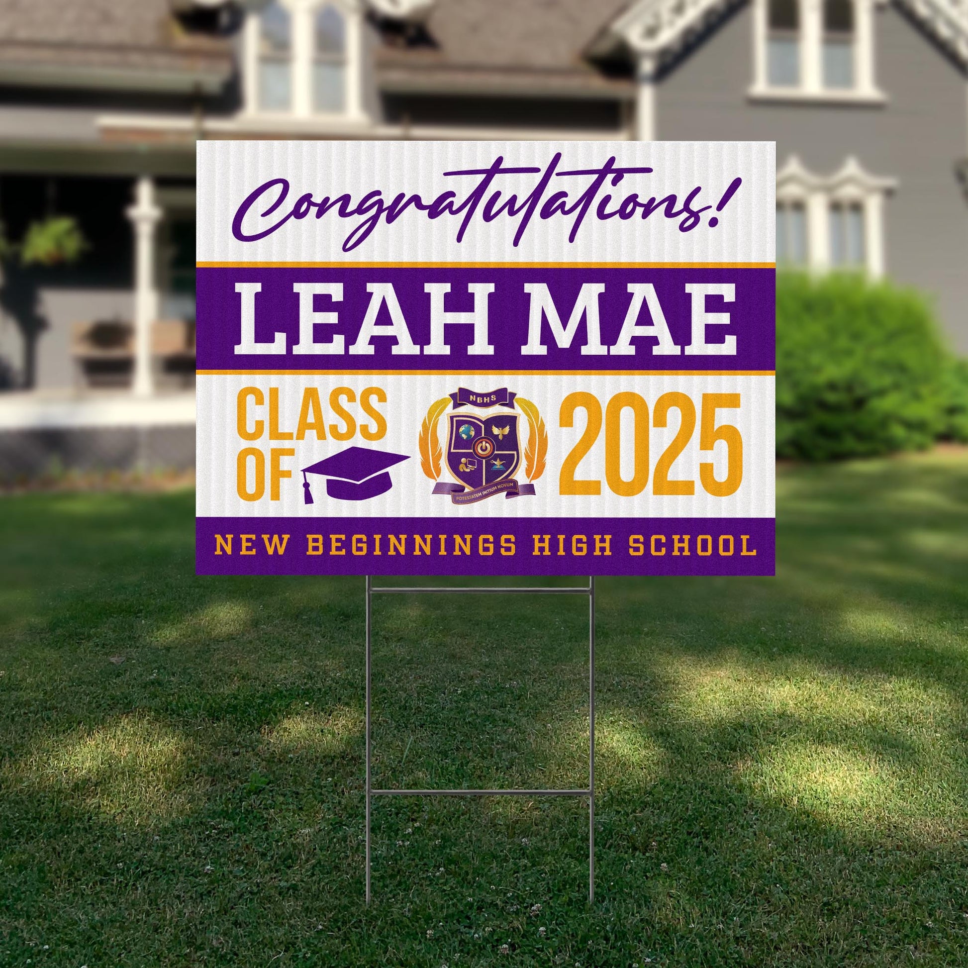 Customizable Design – Celebrate the achievements of New Beginnings High School graduates with personalized yard signs. Add the graduate's name, graduation year, and a congratulatory message to create a unique, custom tribute. It's an easy (and awesome) way for friends, family, and the entire community to recognize and honor their big moment.