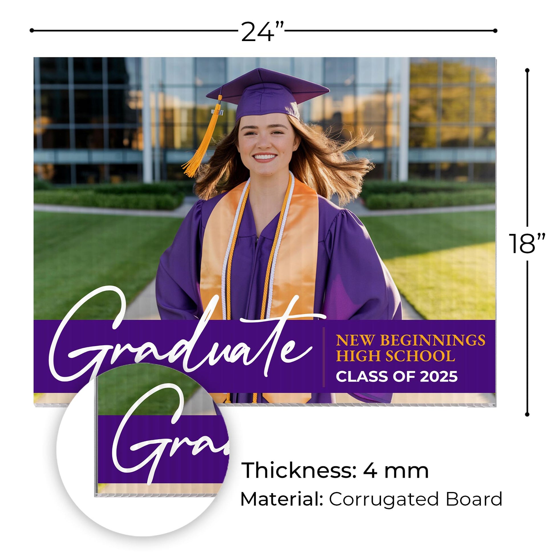 Customizable Design – Celebrate the achievements of New Beginnings High School graduates with personalized yard signs. Add the graduate's name, graduation year, and a congratulatory message to create a unique, custom tribute. It's an easy (and awesome) way for friends, family, and the entire community to recognize and honor their big moment.