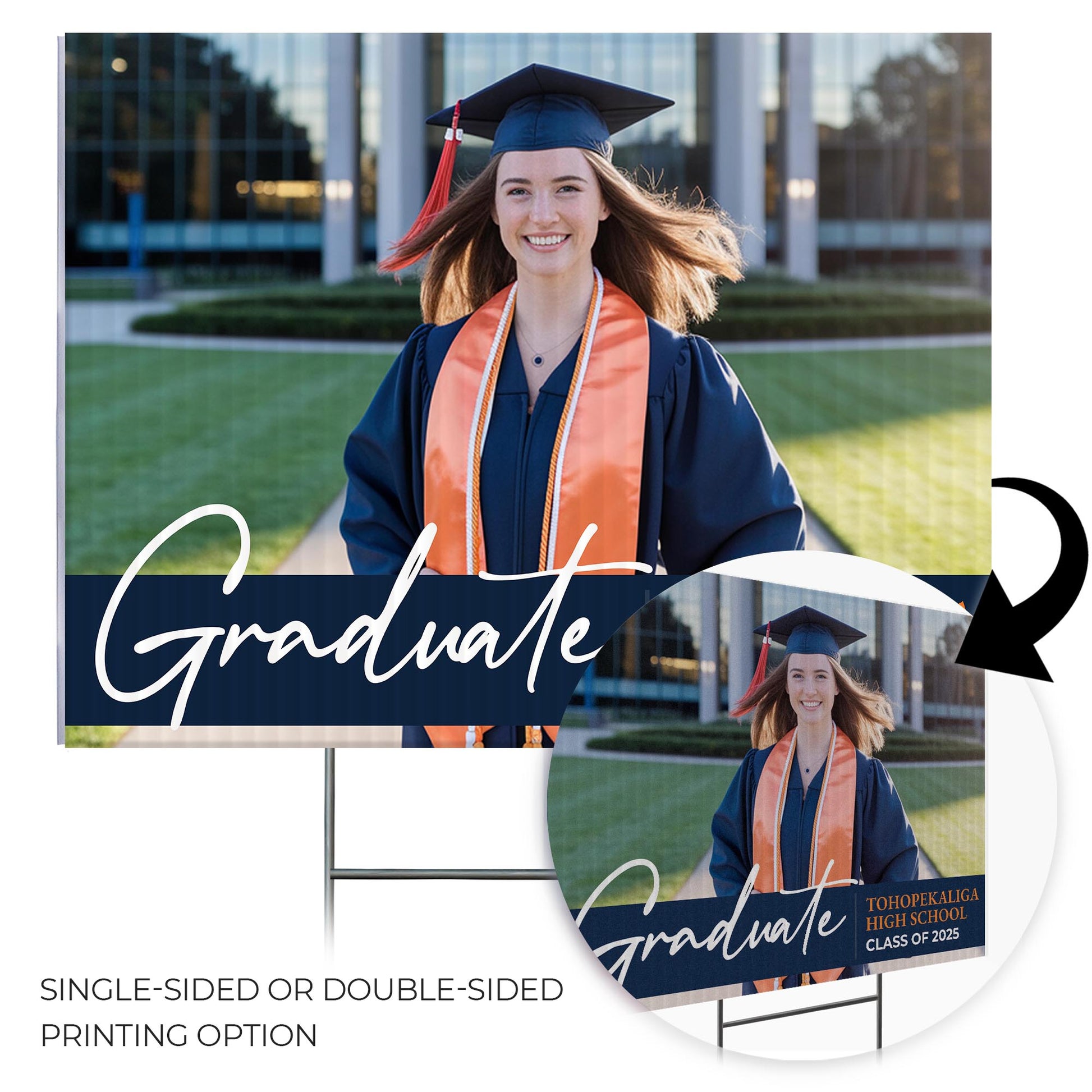 Vibrant Full-Color Printing – Make a statement with bold, full-color graphics printed on both sides of the sign. The eye-catching congratulatory message, along with the graduate's details, ensures visibility from every angle, helping to celebrate this special milestone in style.