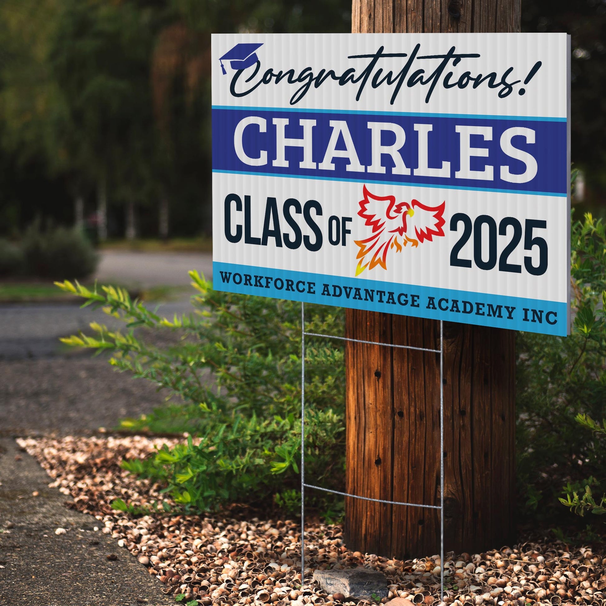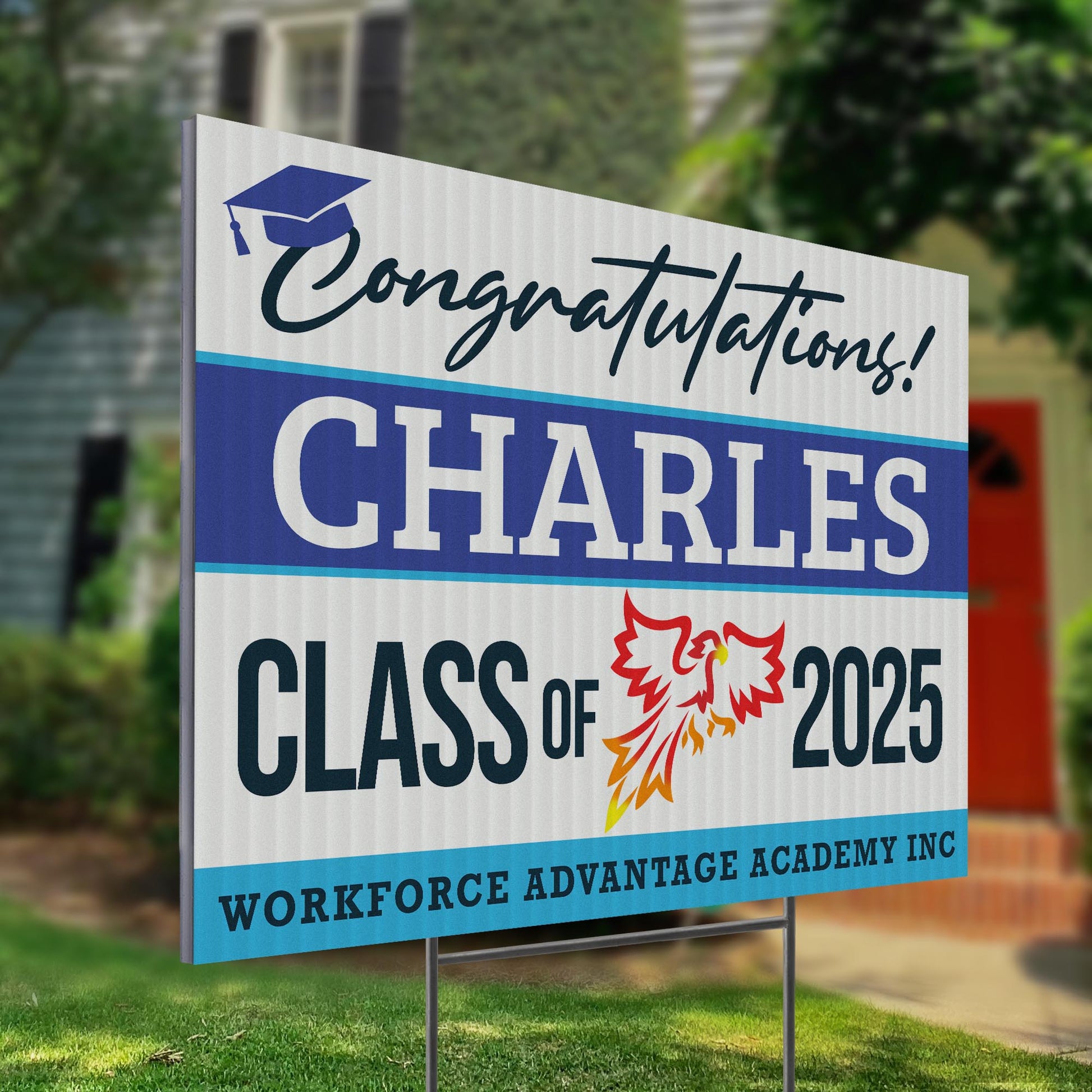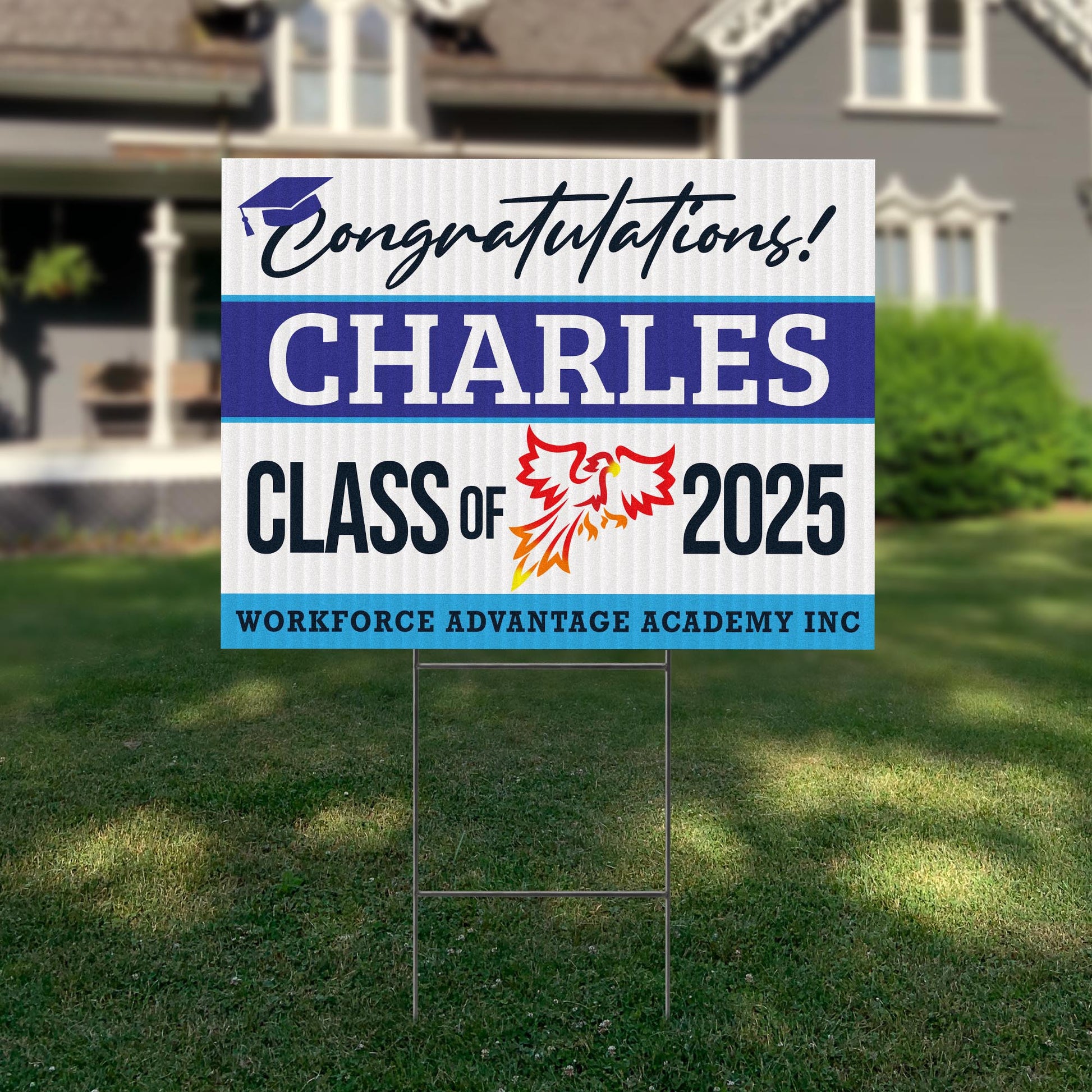Customizable Design – Celebrate the achievements of Workforce Advantage Academy graduates with personalized yard signs. Add the graduate’s name, graduation year, and a congratulatory message to create a unique, custom tribute, making it easy for friends, family, and the community to recognize and honor their accomplishment.