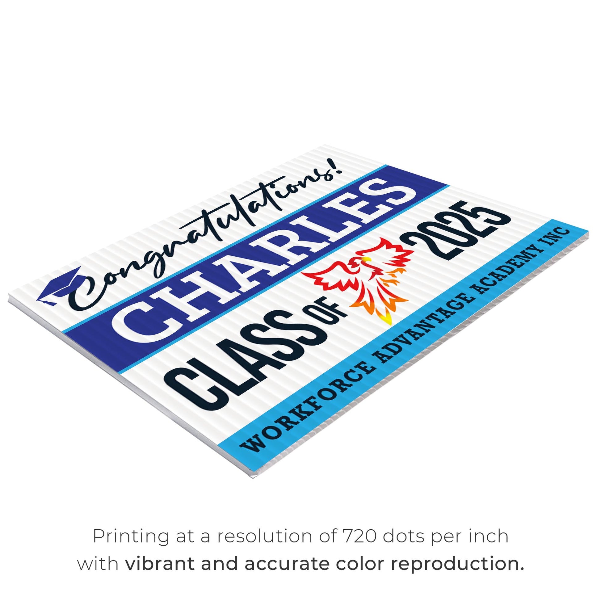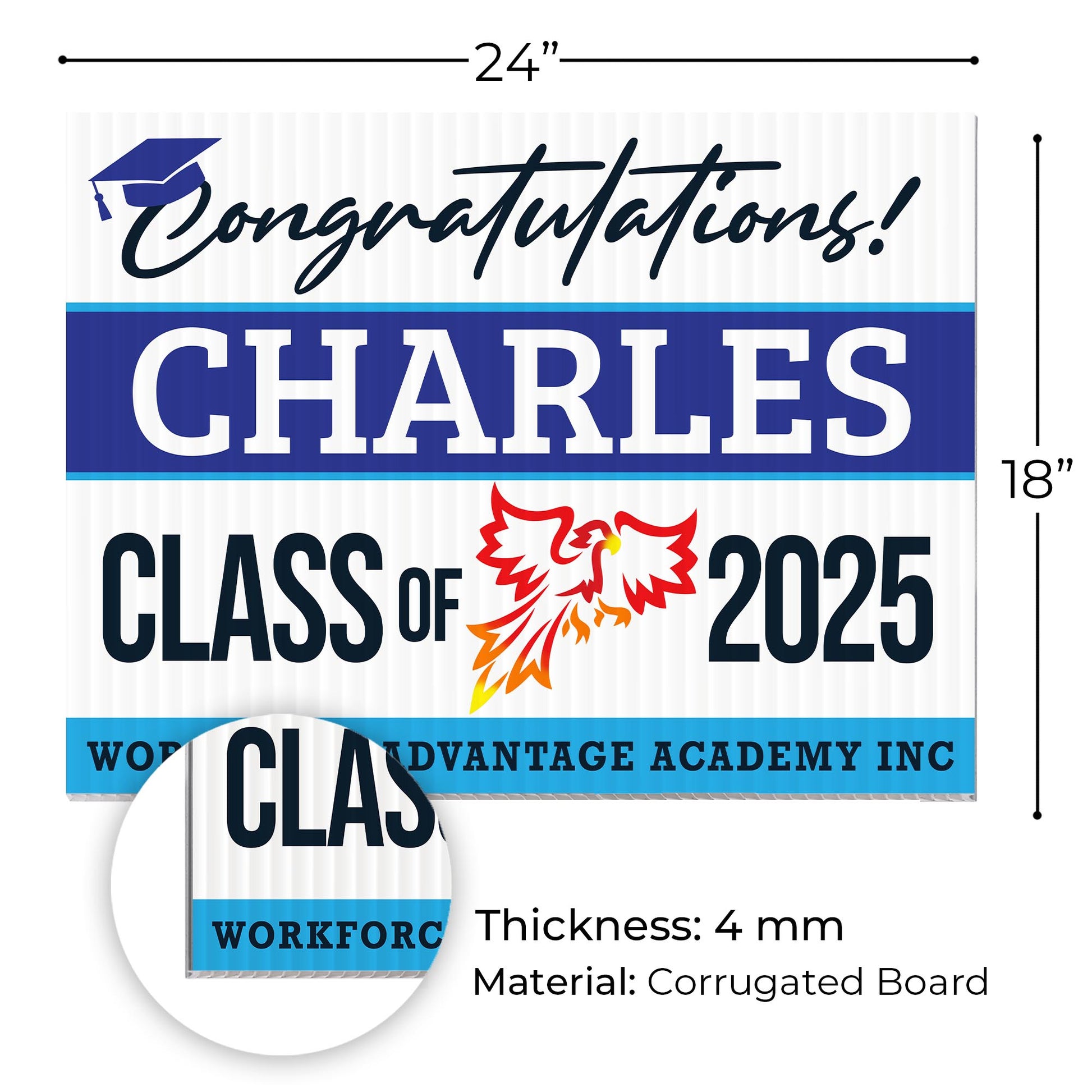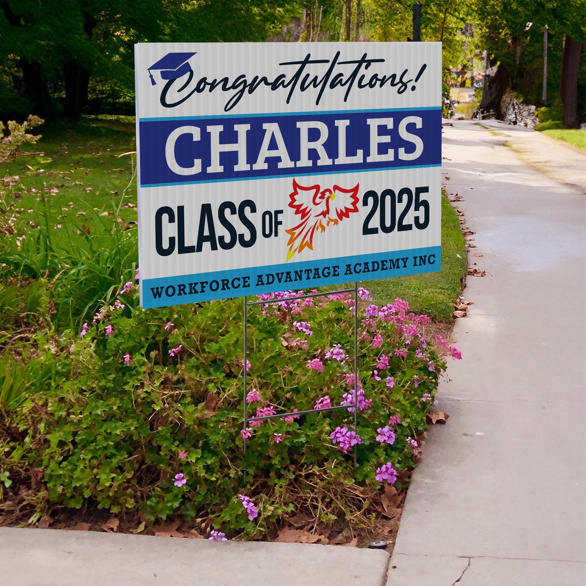 Customizable Design – Celebrate the achievements of Workforce Advantage Academy graduates with personalized yard signs. Add the graduate’s name, graduation year, and a congratulatory message to create a unique, custom tribute, making it easy for friends, family, and the community to recognize and honor their accomplishment.