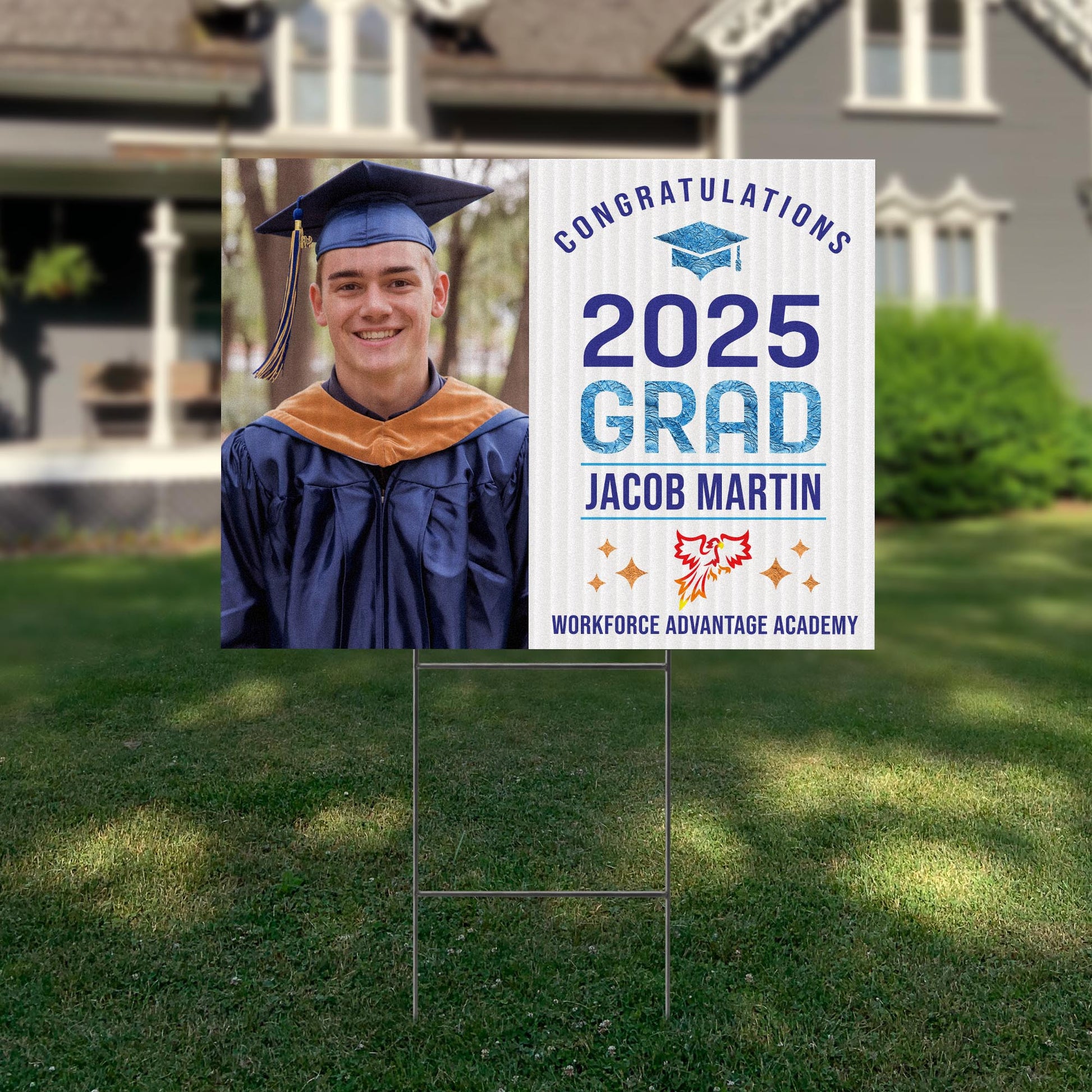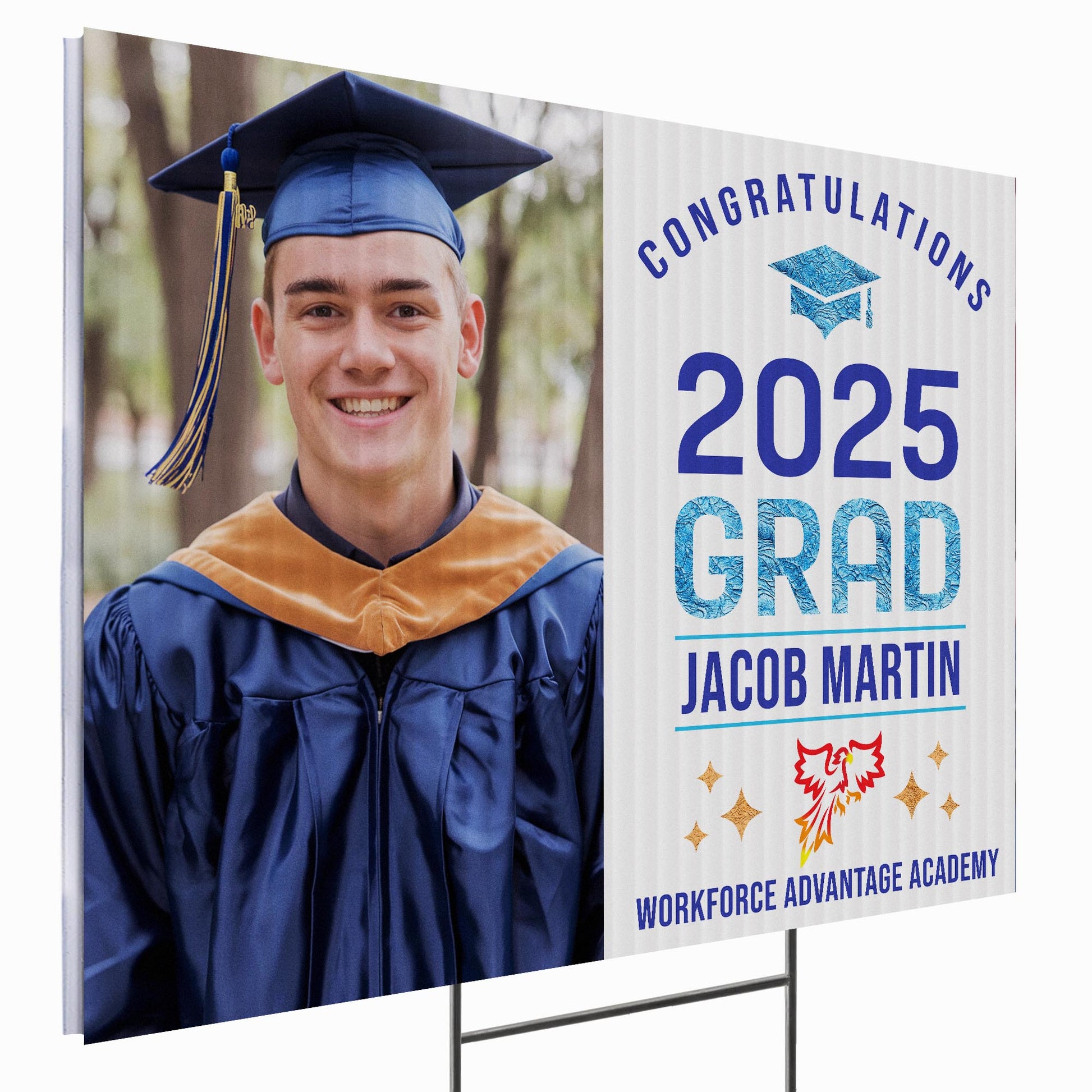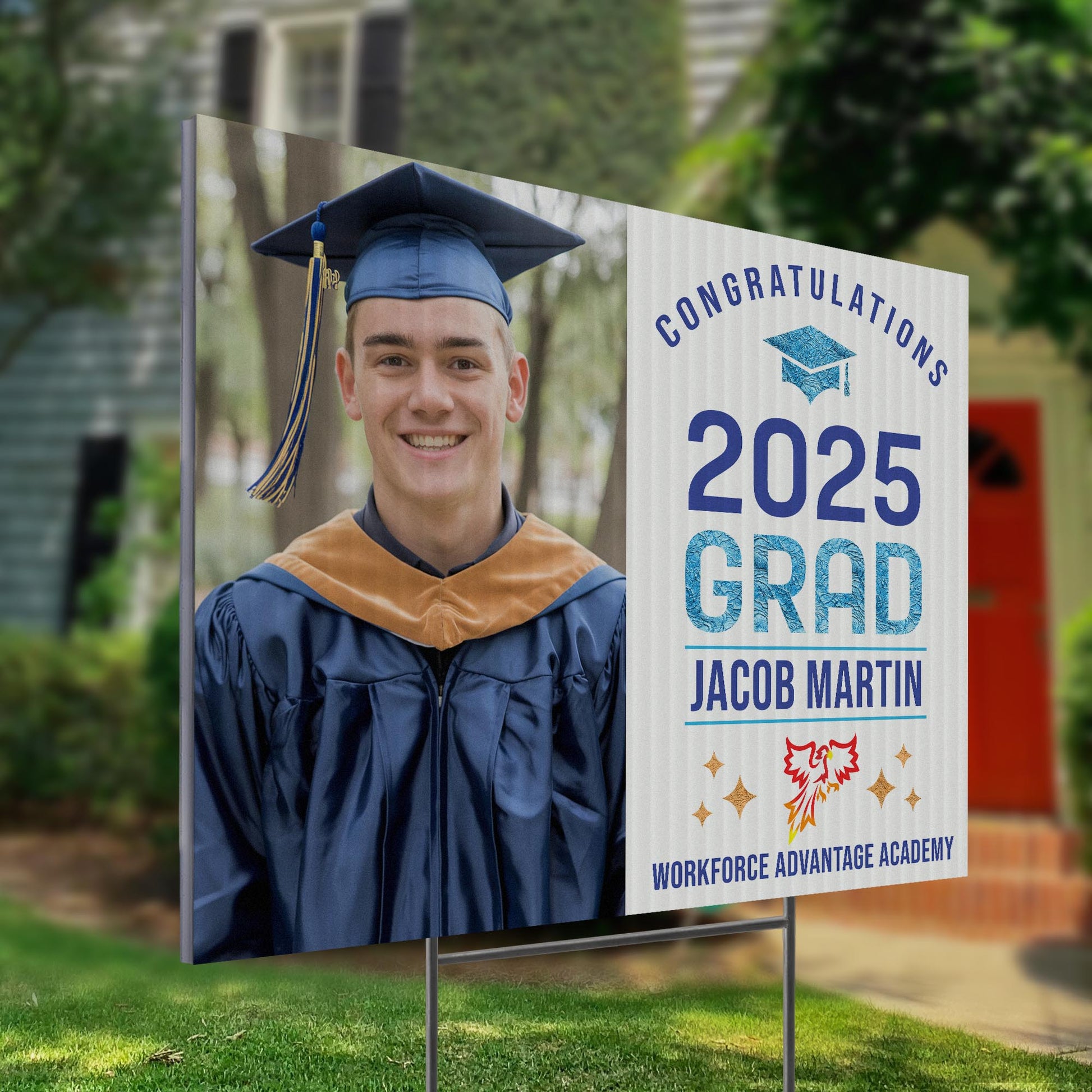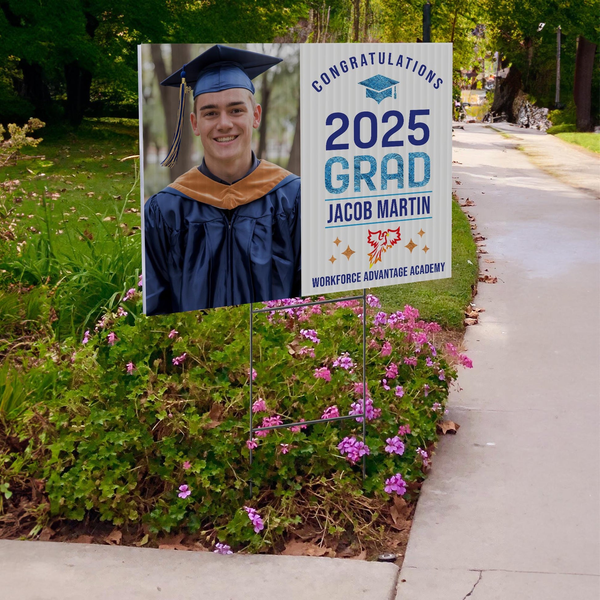 Customizable Design – Celebrate the achievements of Workforce Advantage Academy graduates with personalized yard signs. Add the graduate’s name, graduation year, and a congratulatory message to create a unique, custom tribute, making it easy for friends, family, and the community to recognize and honor their accomplishment.