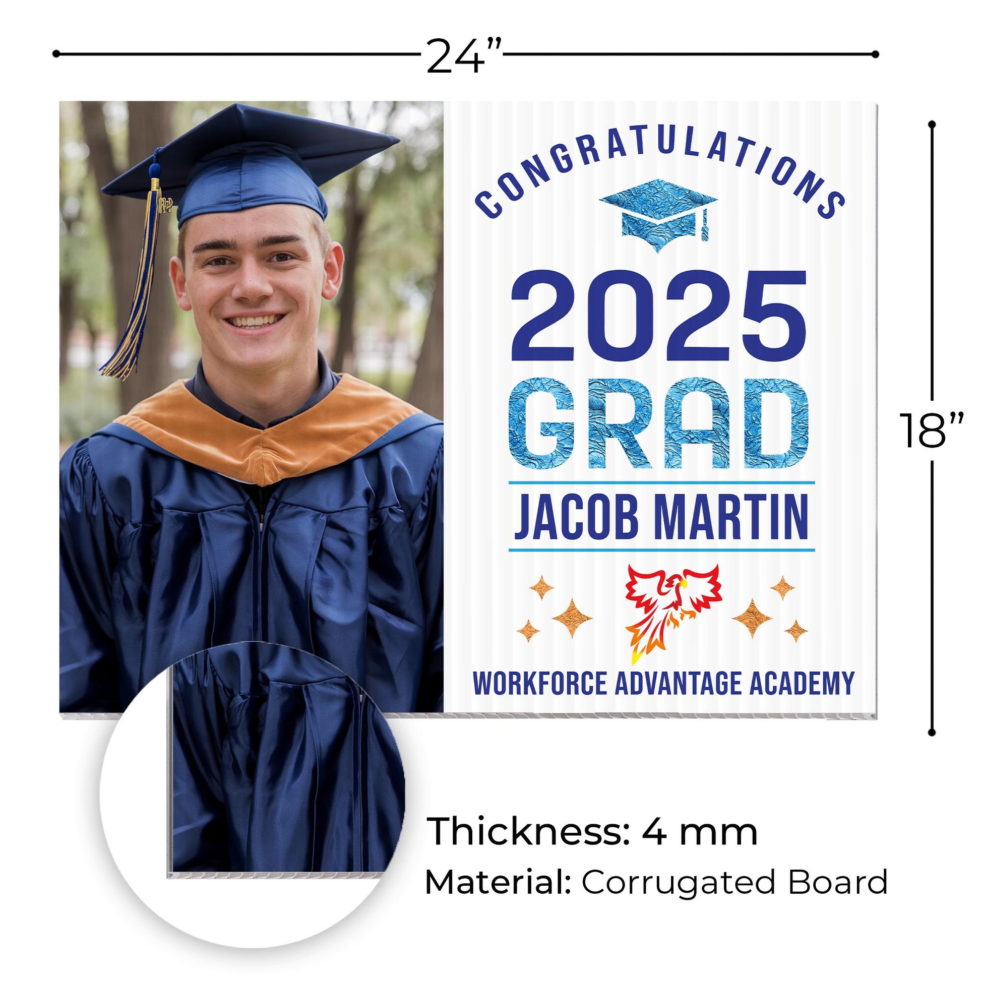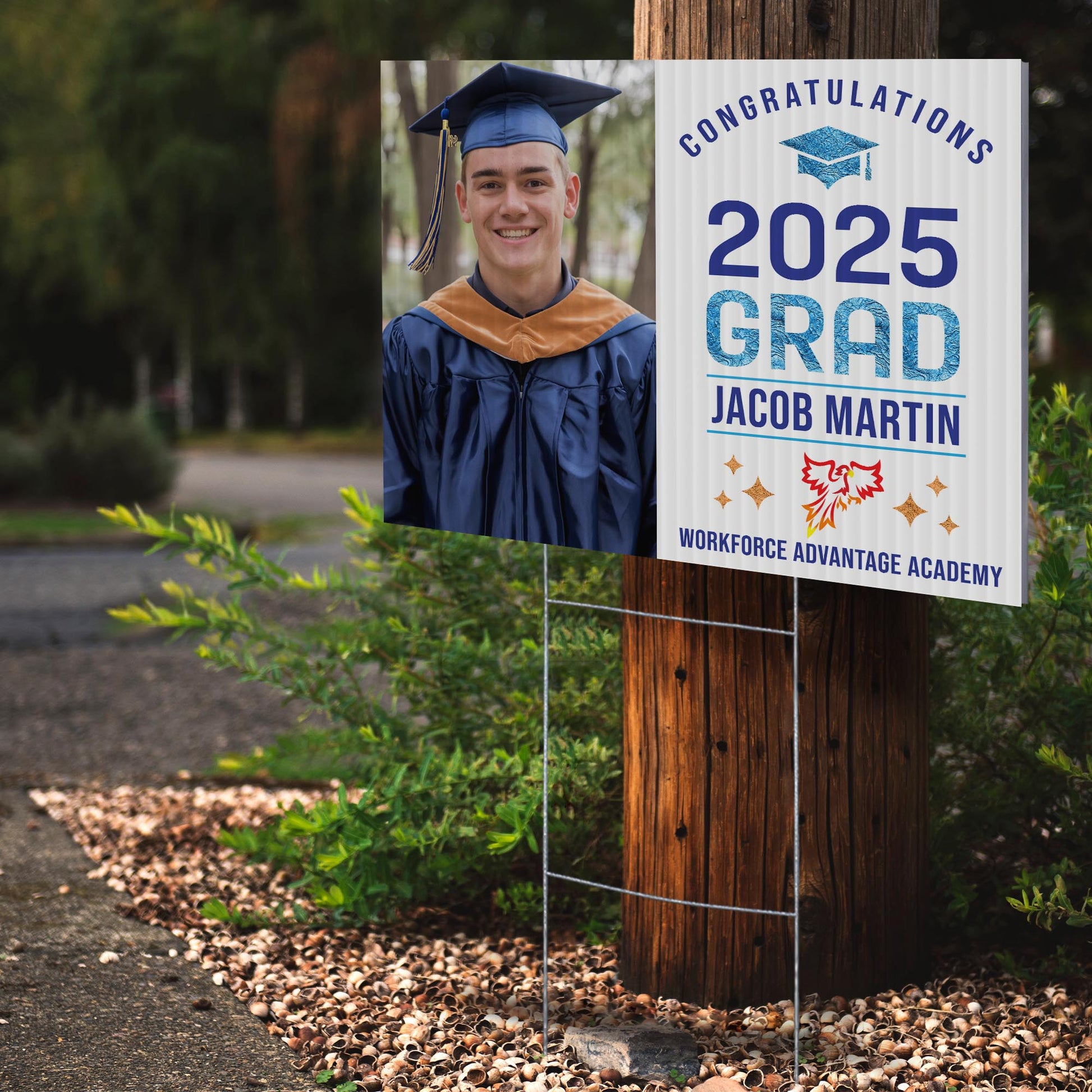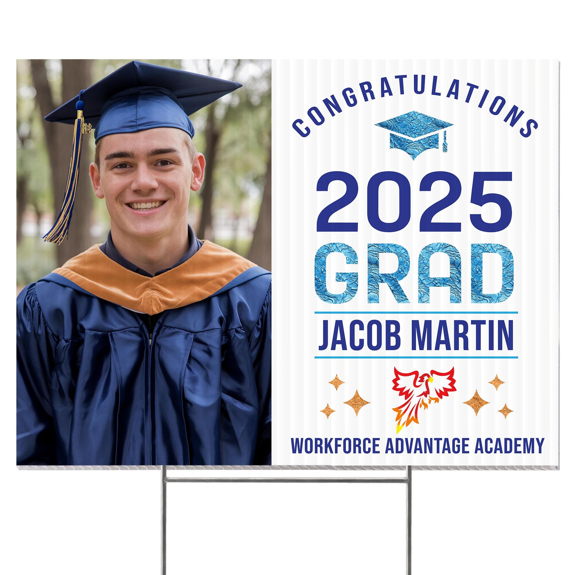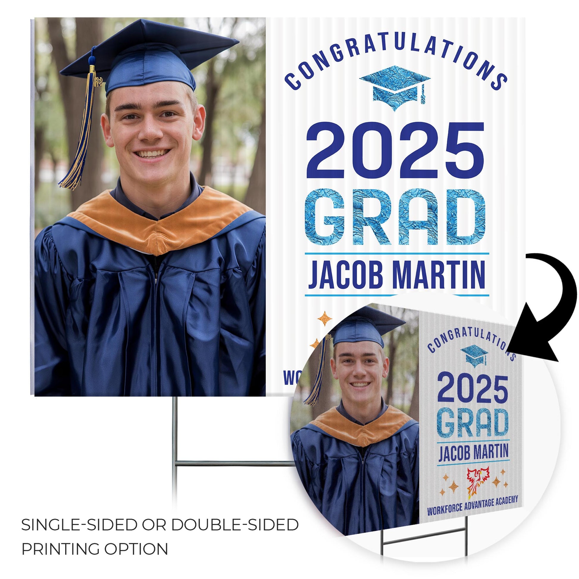Customizable Design – Celebrate the achievements of Workforce Advantage Academy graduates with personalized yard signs. Add the graduate’s name, graduation year, and a congratulatory message to create a unique, custom tribute, making it easy for friends, family, and the community to recognize and honor their accomplishment.